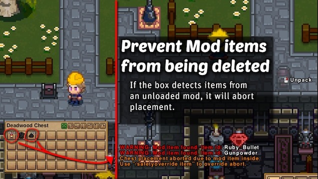 - Предупреждения при размещении: если коробка содержит предметы из выгруженных модов, размещение отменяется с уведомлением. Игрок может принудительно удалить эти предметы при необходимости.
