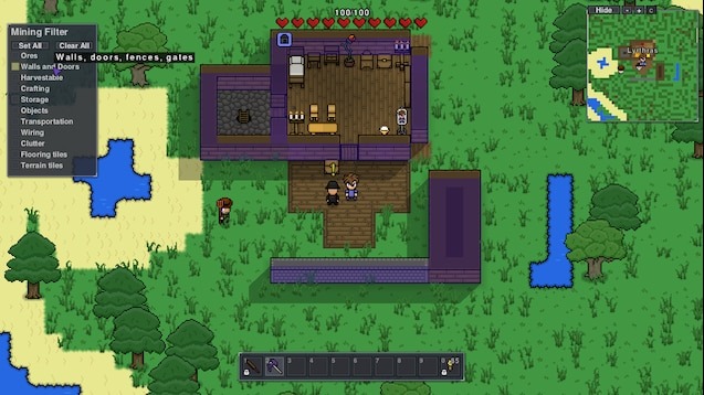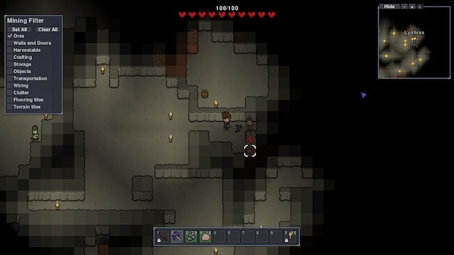 - Добыча с «умным» режимом: Удерживайте клик далеко от игрока для автоматического выбора ближайших блоков (согласно фильтру). Удерживание клика рядом с игроком позволяет вручную выбирать цели.