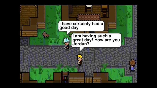 - Общение происходит через текстовые пузыри, появляющиеся над головами NPC.