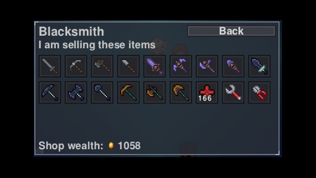 - Кузнецы торгуют инструментами из железа, демонического металла, вольфрама и древнего ископаемого в зависимости от прогресса игрока, а также предлагают несколько видов мечей. Они покупают дополнительные материалы для крафта.