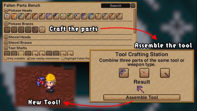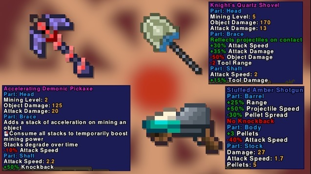 Мод Tool Forge добавляет в Necesse продвинутую систему создания инструментов и оружия из отдельных частей, открывая игрокам путь к полной кастомизации снаряжения. Благодаря этому моду вы сможете самостоятельно собирать кирки, лопаты, дробовики и другие предметы из десятков деталей, получая уникальные комбинации характеристик и бонусов.